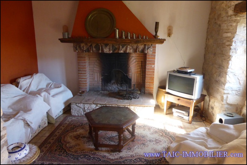 Salon / Salle à manger avec cheminée et donnant sur une belle terrasse de 50m2, expo sud et vue sur la cité de Cordes sur Ciel !