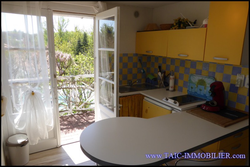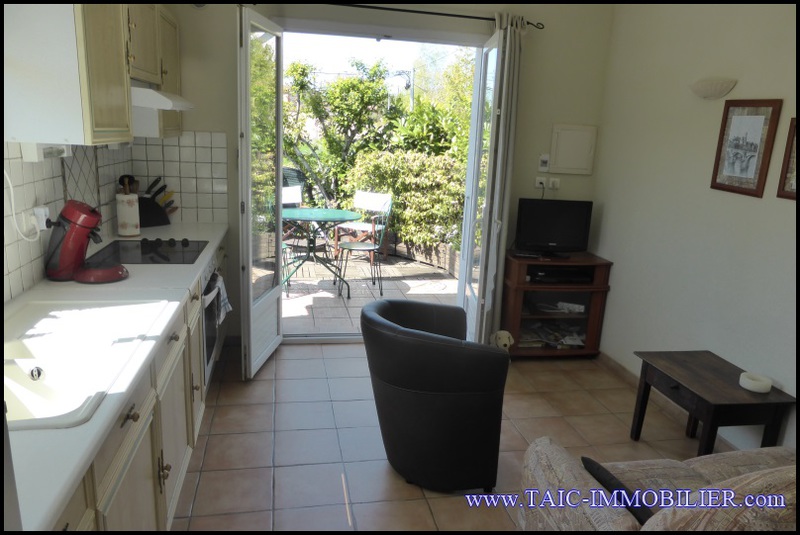 Salon avec sa cuisine équipée et accès sur sa terrasse privative au sud,
