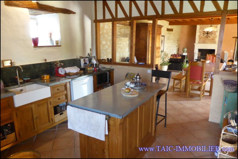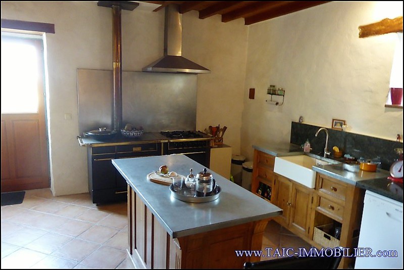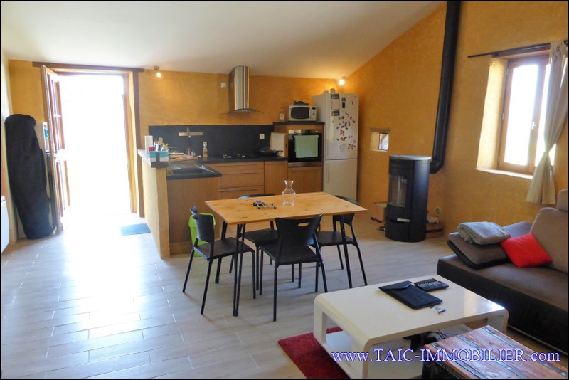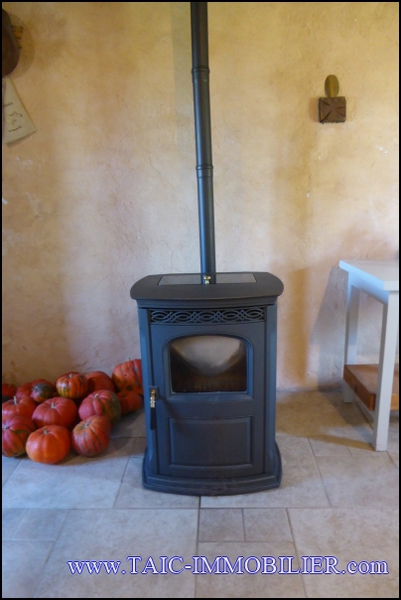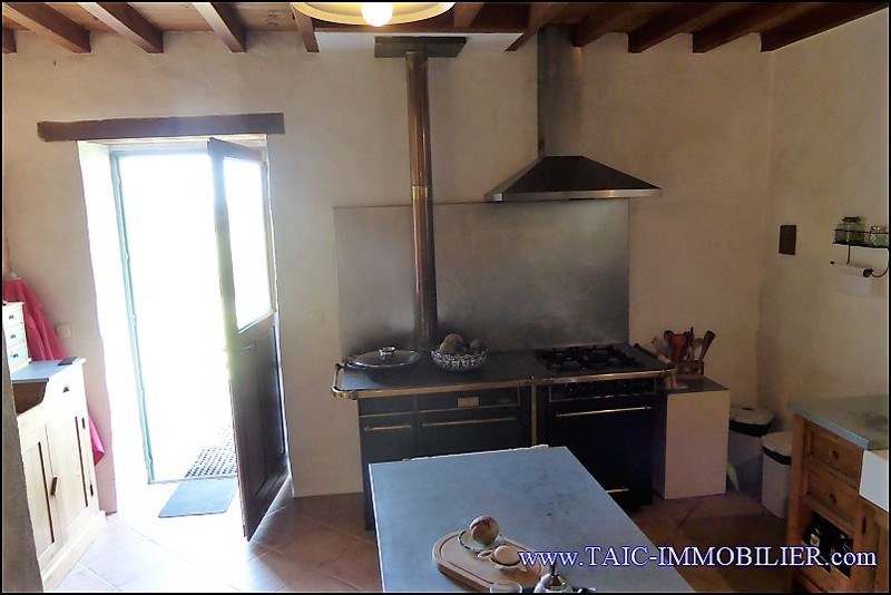Cuisine ouverte sur salon avec cuisinière Godin, buanderie et accès extérieur,