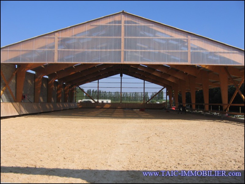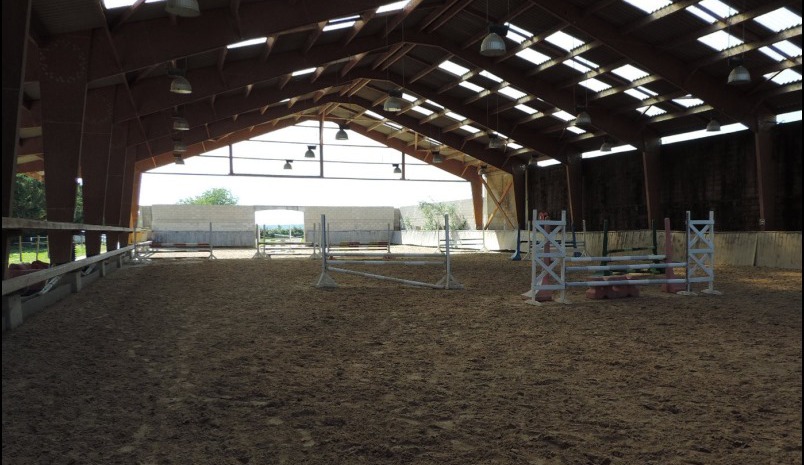 Manège 60x20m en lamellé-collé avec pare-bottes, éclairage, arrosage, auvent,