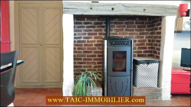 Cuisine ouverte sur salon avec cheminée et poêle à granulés,