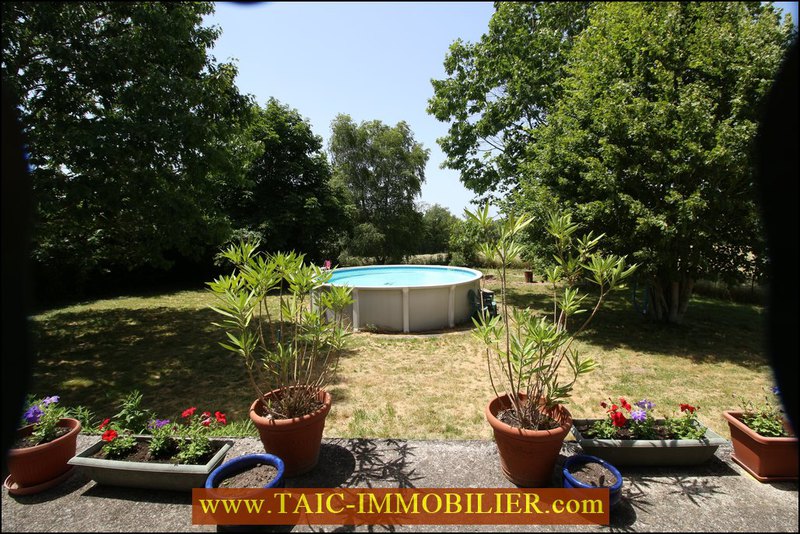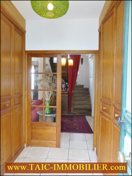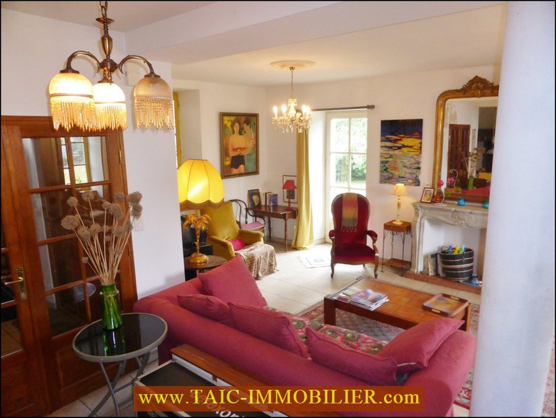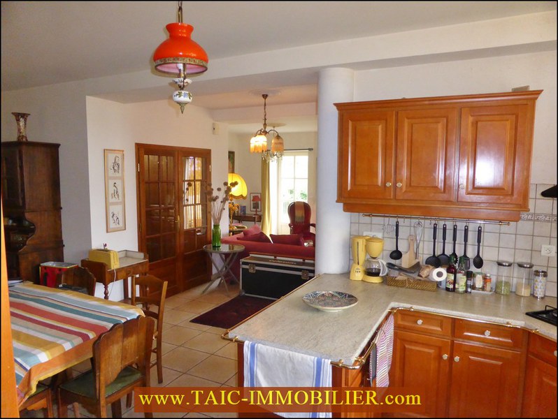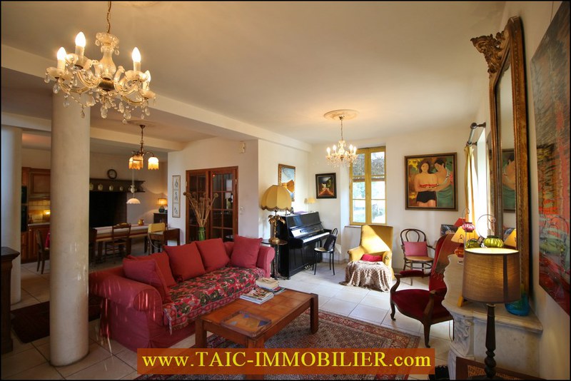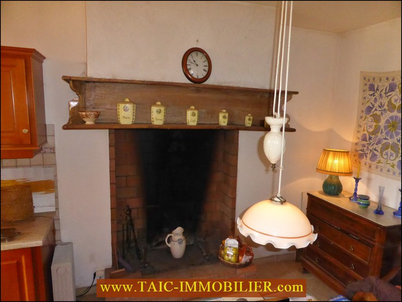 Salon ouvert sur cuisine et salle à manger, accès terrase, cheminée, accès cours et cave.