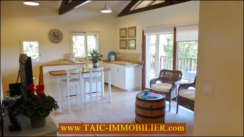 Coin lounge avec sa kitchenette, sa terrasse et escalier donnant sur la chambre du Rez-de-chaussée.