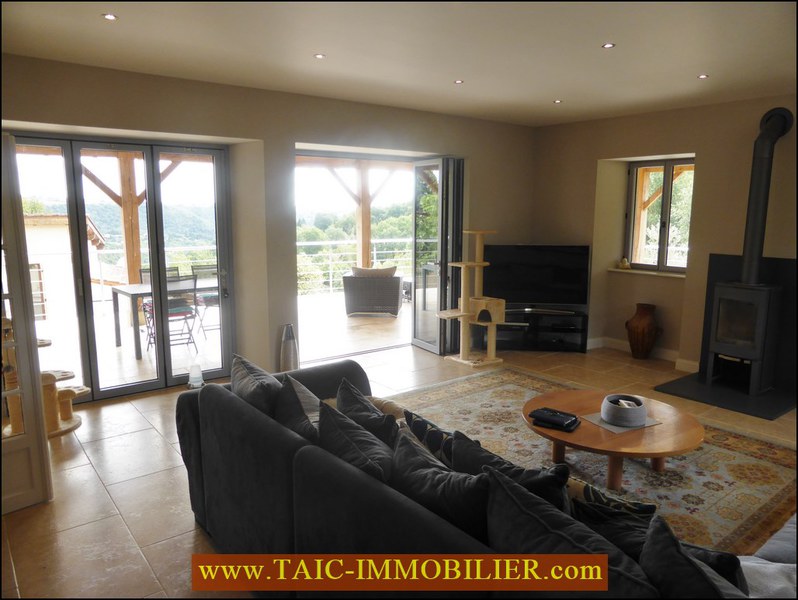 Accès par une vaste terrasse en L avec vue sur la vallée,